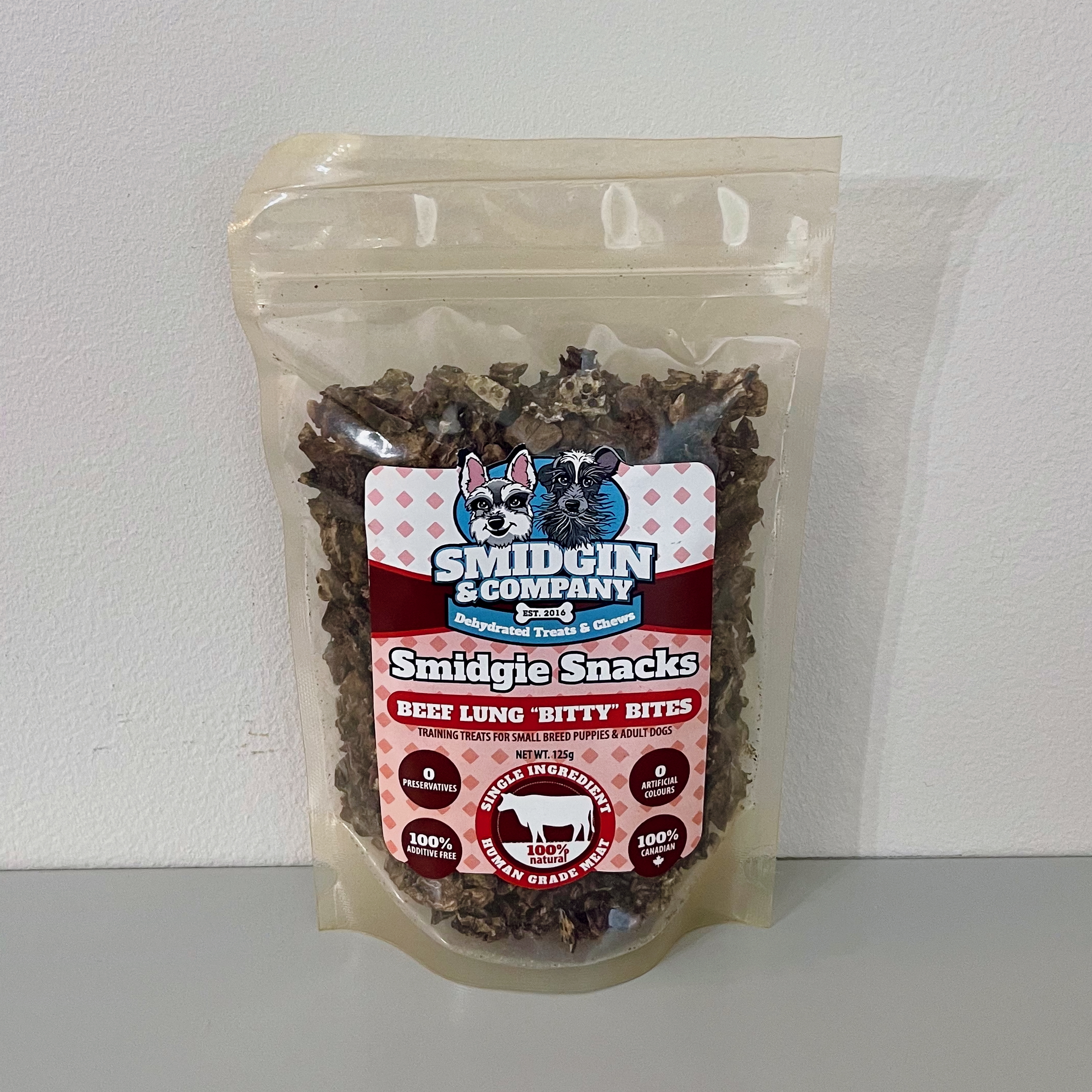 Our Beef Lung BITTY Bites are a SMALLER VERSION of the O.G. Smidgie Snacks—single-ingredient, air-dried, and drool-tested by the toughest critics: our dogs. With a rich, beefy bite and a light, crunchy texture, these itty-bitty training-friendly morsels deliver big taste without fillers, additives, or anything weird you can’t pronounce. Bag Size: 125g