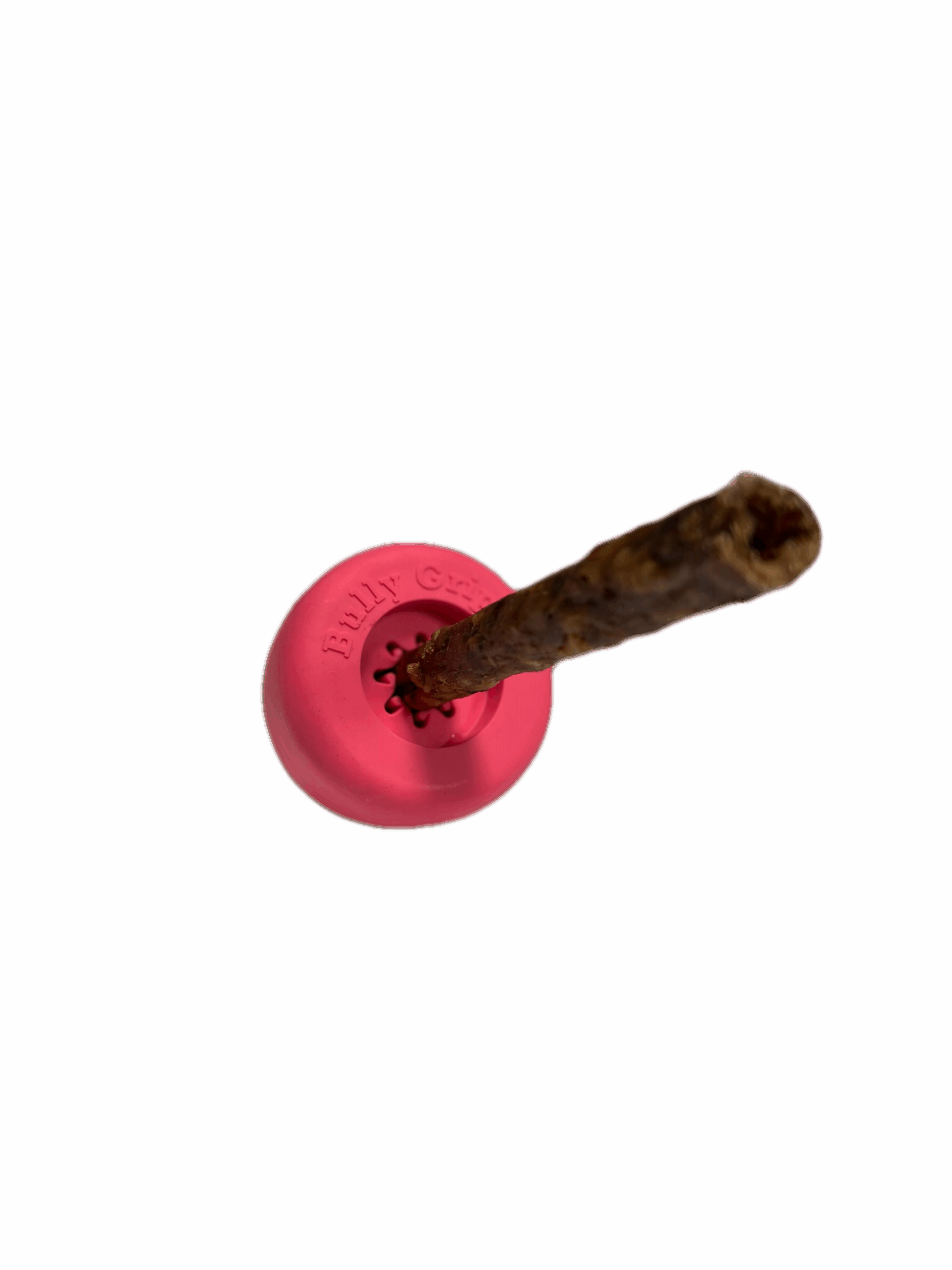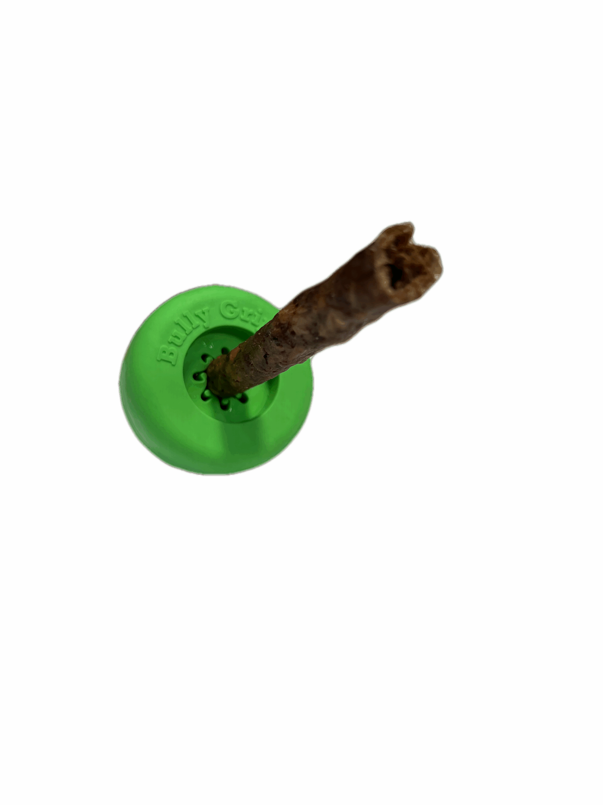 The only Bully stick holder that is all natural rubber! This size fits most bully sticks and hard treat sticks from 1/2″ wide to just under 3/4″ wide. Available in Neon Green or Bright Pink.
